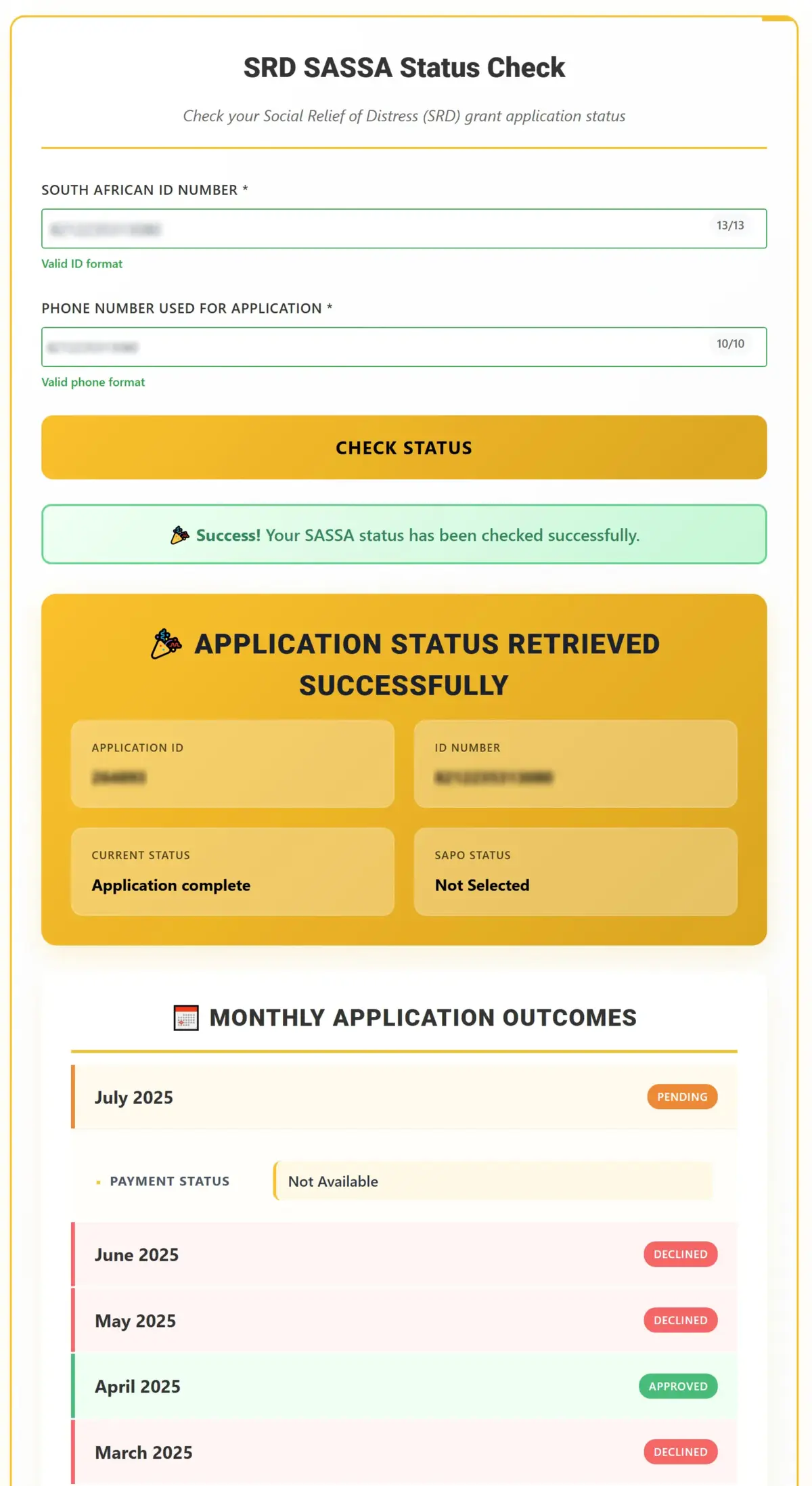 We have attached a sample result of SRD SASSA Status Check performed on our website here below.
